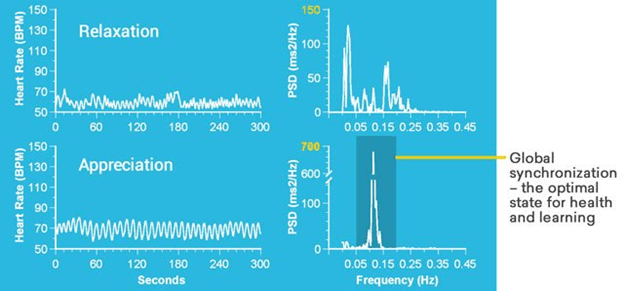 The two graphs on the left show typical heart rate variability (heart rhythm) patterns during states of relaxation and coherence. To the right are shown the HRV power spectral density plots of the heart rhythm patterns at left. Relaxation produces a high-frequency, low-amplitude heart rhythm, indicating reduced autonomic outflow. Increased power in the high frequency band of the HRV power spectrum is observed, reflecting increased parasympathetic activity (the “relaxation response”). In contrast, the coherence state, activated by sustained positive emotions, is associated with a highly ordered, smooth, sine-wave-like heart rhythm pattern.