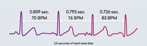 Heart rate variability is a measure of the beat-to-beat changes in heart rate. This diagram shows three heartbeats recorded on an electrocardiogram (ECG). Note that variation in the time interval between consecutive heartbeats, giving a different heart rate (in beats per minute) for each interbeat interval.